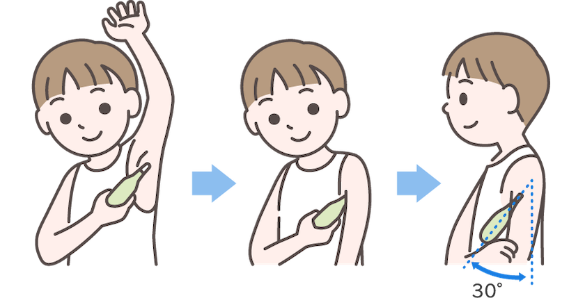 飲食や入浴、運動などをした後および外出後の30分間は検温に適しませんので避けてください。測る前には、必ずワキの汗はしっかり拭きとりましよう。(特にお子さまは汗っかきなので、ご注意ください。)